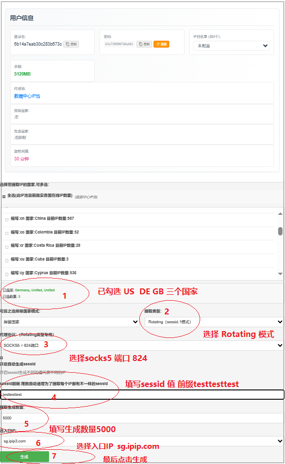 举例2 : 生成提取5000个账户密码验证的socks5,允许IP国家是美国/德国/英国随机提取5000个