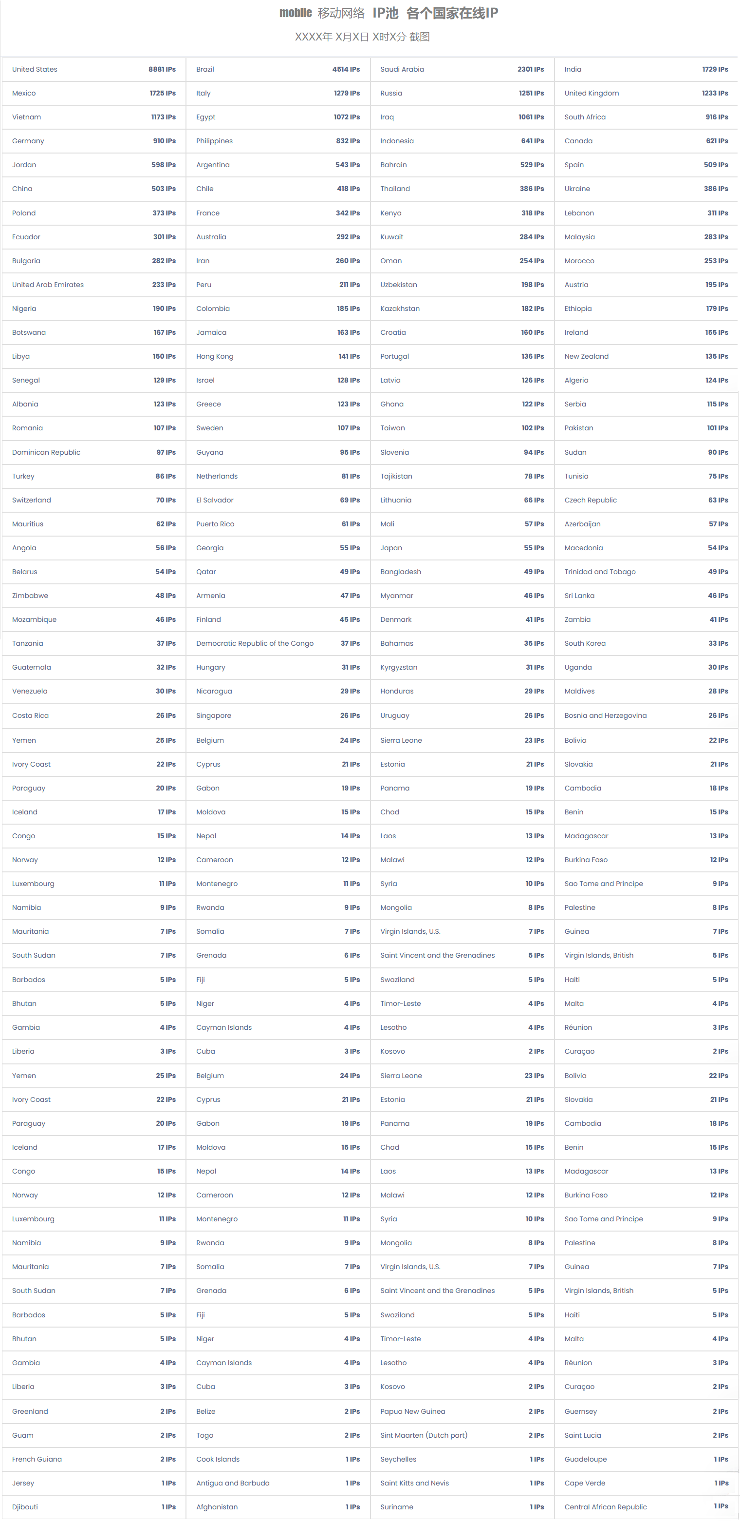 举个例子:如果你需要提取调用美国,提取了10000个IP,设置的30分钟更换一次, 就是说60分钟你需要使用20000个不同的美国IP,如看不到美国目前的真实IP在线数量,想过没,目前正在使用的IP池美国IP目前数量只有1000个,你提取美国1万IP也就是1000IP重复10次使用,再举例你提取的某国家你提取100个使用,IP池该国总数量只有2个IP,你提取100个就是说2个IP重复使用50次.这类IP池提取的我们也别仅凭他们说或者显示的数量,正确做法是提取5000-2万使用检测落地IP就能知道IP池真实的情况,这很重要
